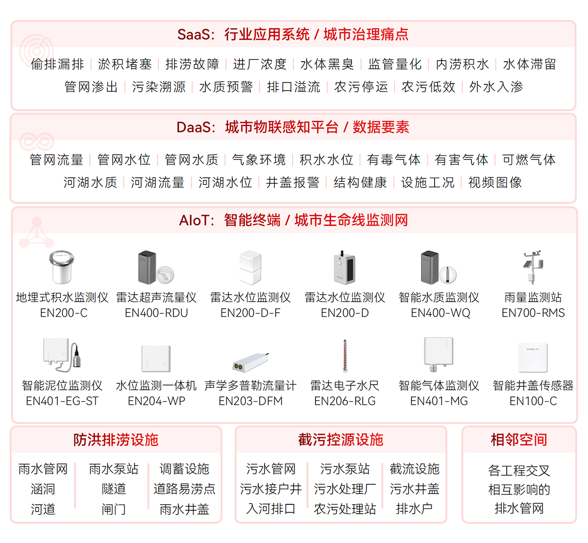 對排水設施(雨污水管網、窨井蓋、截流泵站、提升泵站、抽水泵站、農村污水處理站、溢流井、排水井、污水處理廠、調蓄設施等)關鍵節(jié)點、易澇積水點,河湖水位、流速,管網液位、流速、水質,內澇積水等指標進行實時數(shù)據(jù)監(jiān)測,形成設施完整、拓撲清晰、位置準確的排水設施“一張圖”,為排水空間規(guī)劃、設計、排水設施改造提供決策支持。